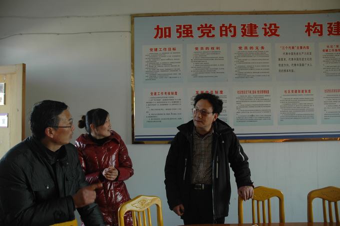 图为杨爱国局长向社区工作人员了解各户贫困家庭的详细情况。