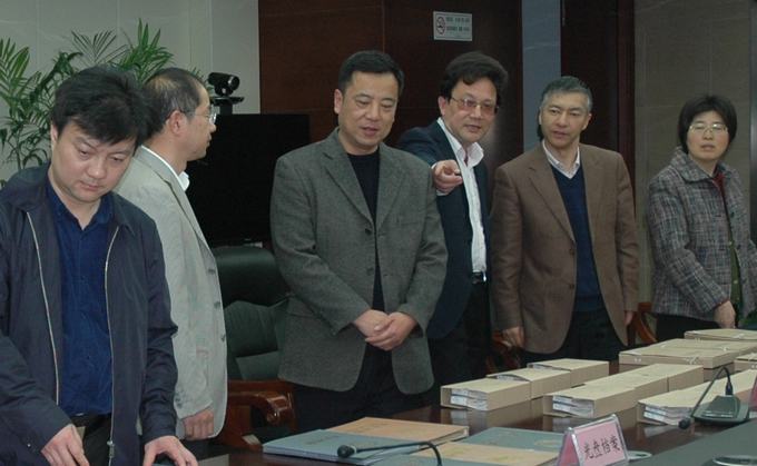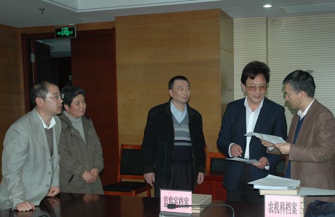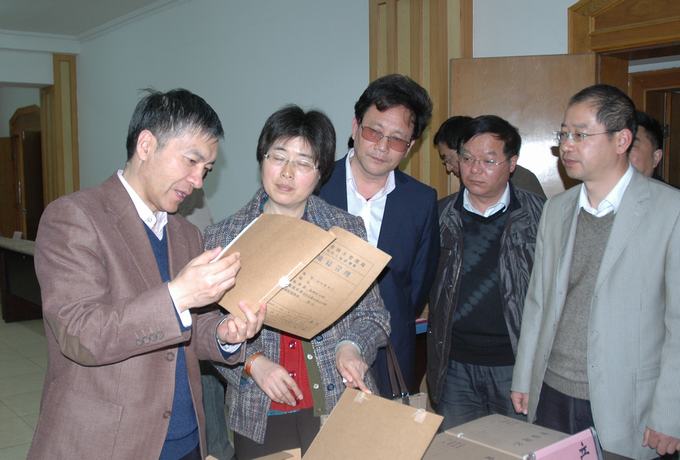 图为国家档案局农业农村处处长王冰(右二)、农业部农经司处长王彩明(右二)、江苏省档案局丁原处长在市水务局查看相关档案资料