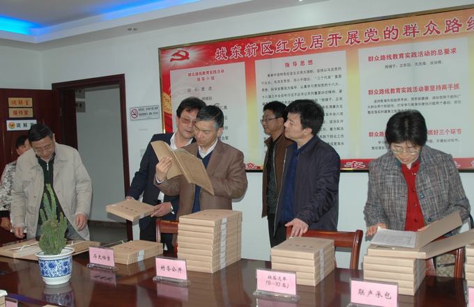 图为检查组成员在城东新区红光村兴致勃勃阅看该村五六十年代的历史档案