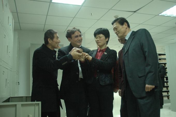 图为王加林一行查看印章档案