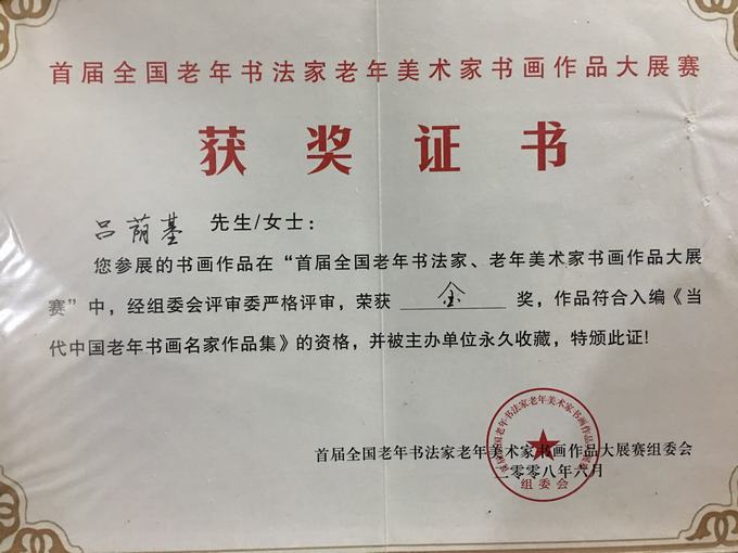 2006年,在“百花杯”全国中老年诗书画精品大赛中,吕老荣获“中国实力派著名画家”称号。2007年他的力作《八百春秋》在全国中老年诗书画家精品大赛中,被评为国画银奖;2008年,他的国画在首届全国老年书法家、老年美术家书画作品大展赛中获得金奖,并被大赛组委会、画圣吴道子艺术研究馆、北京华夏国艺书画院授予“百名德艺双馨书法家、美术家”荣誉称号。